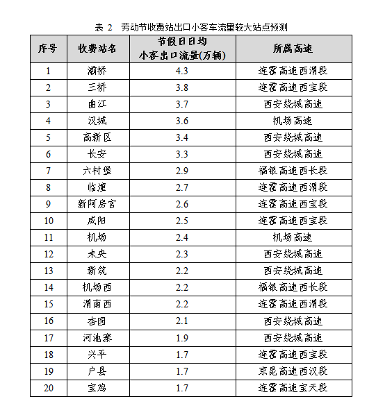 劳动节流量较大的收费站预计主要集中在西安周边。从收费站出、入口流量来看,出口流量(下高速)较大的前十个收费站为:灞桥、三桥、曲江、汉城、高新区、长安、六村堡、临潼、新阿房宫、咸阳;入口流量(上高速)较大的前十个收费站为:长安、高新区、灞桥、曲江、咸阳、三桥、机场西、临潼、新筑、渭南西。