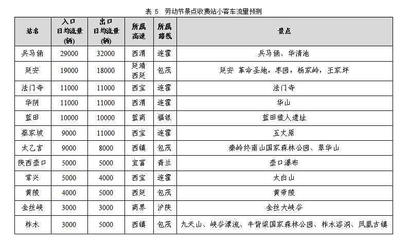 陕西省高速公路劳动节期间流量较平日增长较多,去往兵马俑、延安、法门寺、华山等热门景区的高速公路出入口通行压力大。详细预测情况见下表。