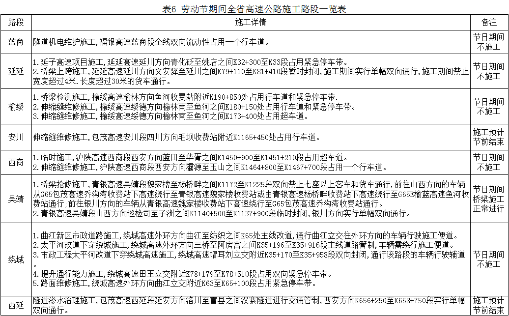 劳动节期间,全省高速公路施工情况如下,请通行施工路段的车辆提前减速、谨慎通过。