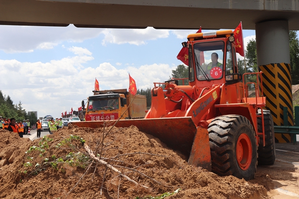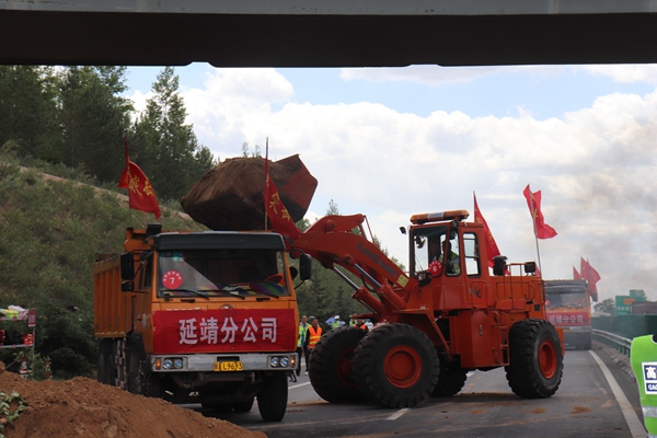 同时,延安片区公路抢通组通过实地查看险情,拟定处置方案:对滑塌体土方进行集中装载外运,并完成现场清理,恢复公路畅通。由于延靖分公司机械、物资设备有限,抢通组请求指挥部增派机械和物资援助。随后,延安片区6家单位先后共派出自卸车辆、装载机 、救援拖挂车、水车、应急车辆57台,公安制式警车、路政车7台,沙土80余方,反光背心、雨衣、铁锹等物资共300余件进行增援。机械清理完成后,抢通组立即组织人工抢险队伍进行抢险作业,并对垮塌边坡进行加固。经过1个小时的持续奋战,滑塌土方全部清理完毕,护坡维修加固基本完成,经现场勘查评估,确定可排除险情,恢复公路畅通。演练总指挥随即对本次演练进行分析评估,详细总结了本次演练的特点和效果,分析存在问题和不足。