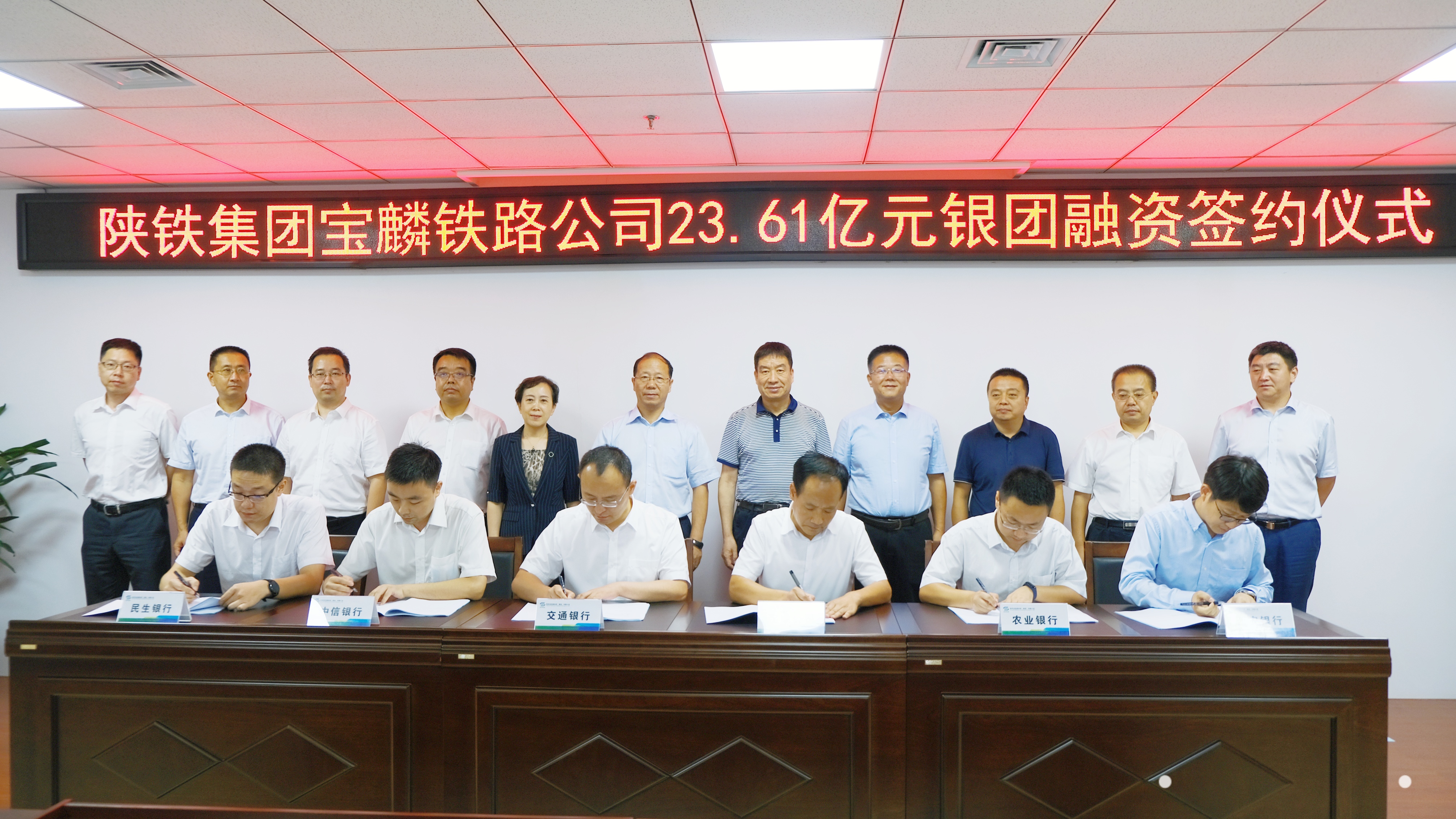 9月9日,陕西宝麟铁路23.61亿元银团贷款融资签约仪式在西安陕铁大厦举行。省铁路集团党委书记、董事长乔怀玉,交通银行陕西分行党委书记、行长程清洁,陕铁投公司党委书记、董事长刘连昌以及农业银行陕西分行、民生银行宝鸡分行、中信银行宝鸡分行、西安银行宝鸡分行等银团贷款参与行相关领导、工作人员出席签约仪式。陕西宝麟铁路有限责任公司总经理孙德芹向出席嘉宾介绍宝麟铁路建设运营及中长期发展基本概况,交通银行陕西分行党委委员、副行长梁欢向签约仪式致辞。