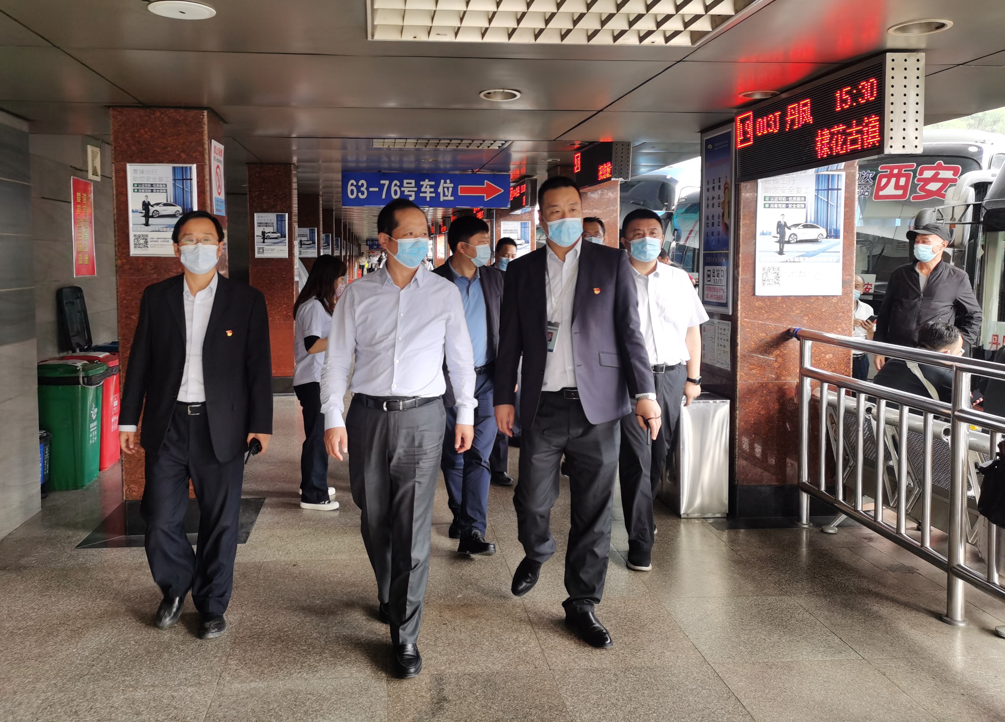 9月29日下午3:00,省交通运输厅副厅长戴滨华,到省西安汽车站检查安全生产及“双节”前反恐维稳及疫情防控工作。厅安监处、厅运输处、省道路运输服务中心相关领导陪同检查。戴滨华副厅长对省站“三品”安检区、售票区、实名制检票区、落客区等环节的安全生产、反恐维稳,疫情防控情况进行了详细检查,省西安汽车站站长王亮详细汇报了车站安全生产工作和“双节”的疫情防控和反恐维稳的工作开展情况。
