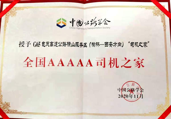 2020年11月19日,全国“司机之家”建设运营经验交流会在广东省佛山市召开,会上通报了全国“司机之家”等级评定情况,并对全国首批44个AAAAA级“司机之家”进行授牌,榆靖分公司横山服务区被授予AAAAA级“司机之家”,也是交通集团首家AAAAA级“司机之家”。