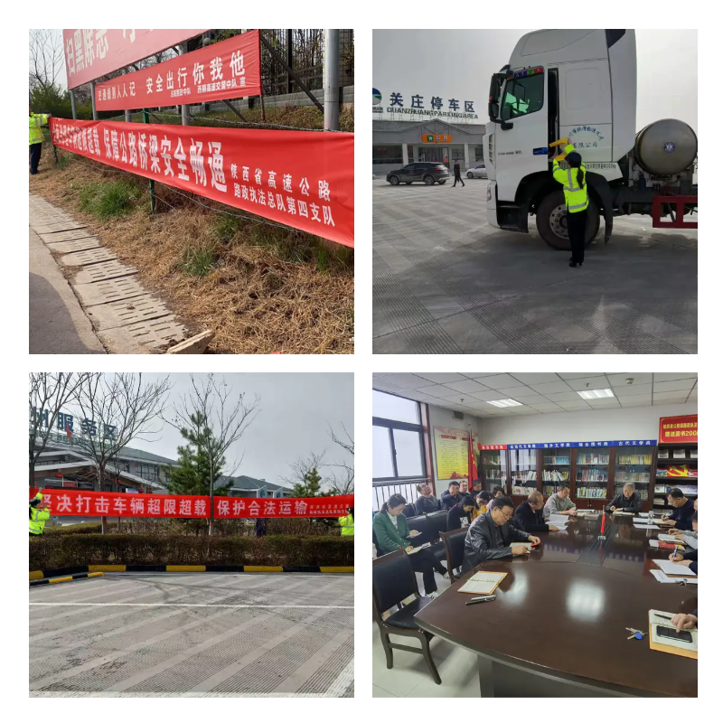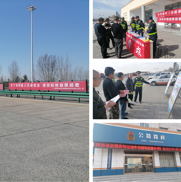 图为总队第二支队在眉县服务区、眉县收费站采取悬挂宣传条幅、发放宣传单等方式,向过往货运车辆驾驶员和车主宣传《治超条例》,解读治超法规政策,并现场答疑,用案例讲述超限超载运输的危害,教育引导人民群众自觉抵制超限超载行为。截至目前,出动宣传车3台,宣传人员12人次,发放宣传单200余份,解答群众咨询10余次。