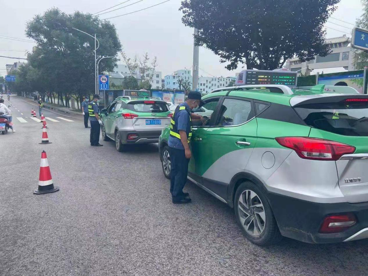 二是加大路面执法检查力度。执法人员深入汽车站点、医院、市场、商场、小区周边等市区主要干道及重点区域,对出租车车容车貌、车内外卫生、车辆标志标识、服务监督卡、营运证、灭火器和应急警示三角架安全设施,驾驶员从业资格证、着装、使用文明用语、提醒乘客扫码乘车和佩戴口罩、车辆消毒等疫情防控措施落实情况进行执法检查。