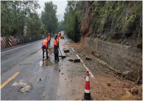 洛川公路段职工坚持24小时在岗在位,“排查、巡查、抢险”不停歇,铁锨油锯不离手,及时处理突发公路事件,做“沉浸式”工作的公路人,为百姓安全出行保驾护航。该段联合县级交通部门对路基悬空、路面沉陷、路面裂缝等不能立即抢通的路段,实行交通管制,摆放警示锥形桶、设置提示牌引导出行;对出现泥石流且阻碍交通路段,做警示处理,即刻安排人员和机械上路清理路障;对行道树倾倒占道现象,立即处理,并发动职工转发路况信息,提醒百姓安全出行。截至目前,洛川公路段辖区内共有水毁路段6处,塌方59处。现已清理塌方2356立方米,出动人员180人/6天,车辆24台/6天。
