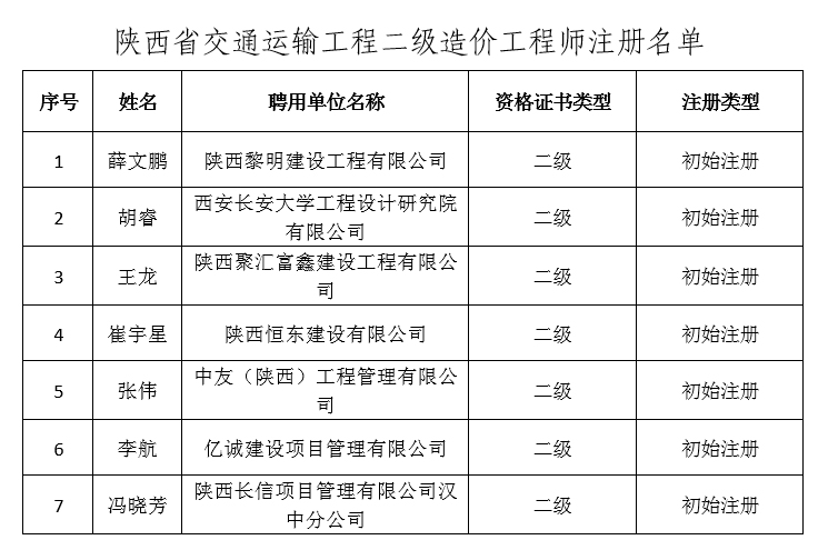 附件:陕西省交通运输工程二级造价工程师注册名单