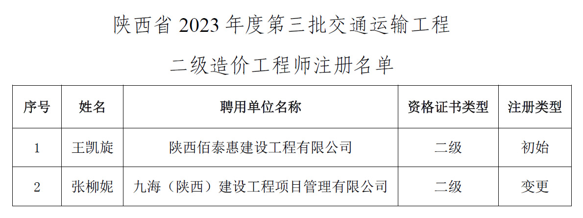 附件:陕西省2023年度第三批交通运输工程二级造价工程师注册名单